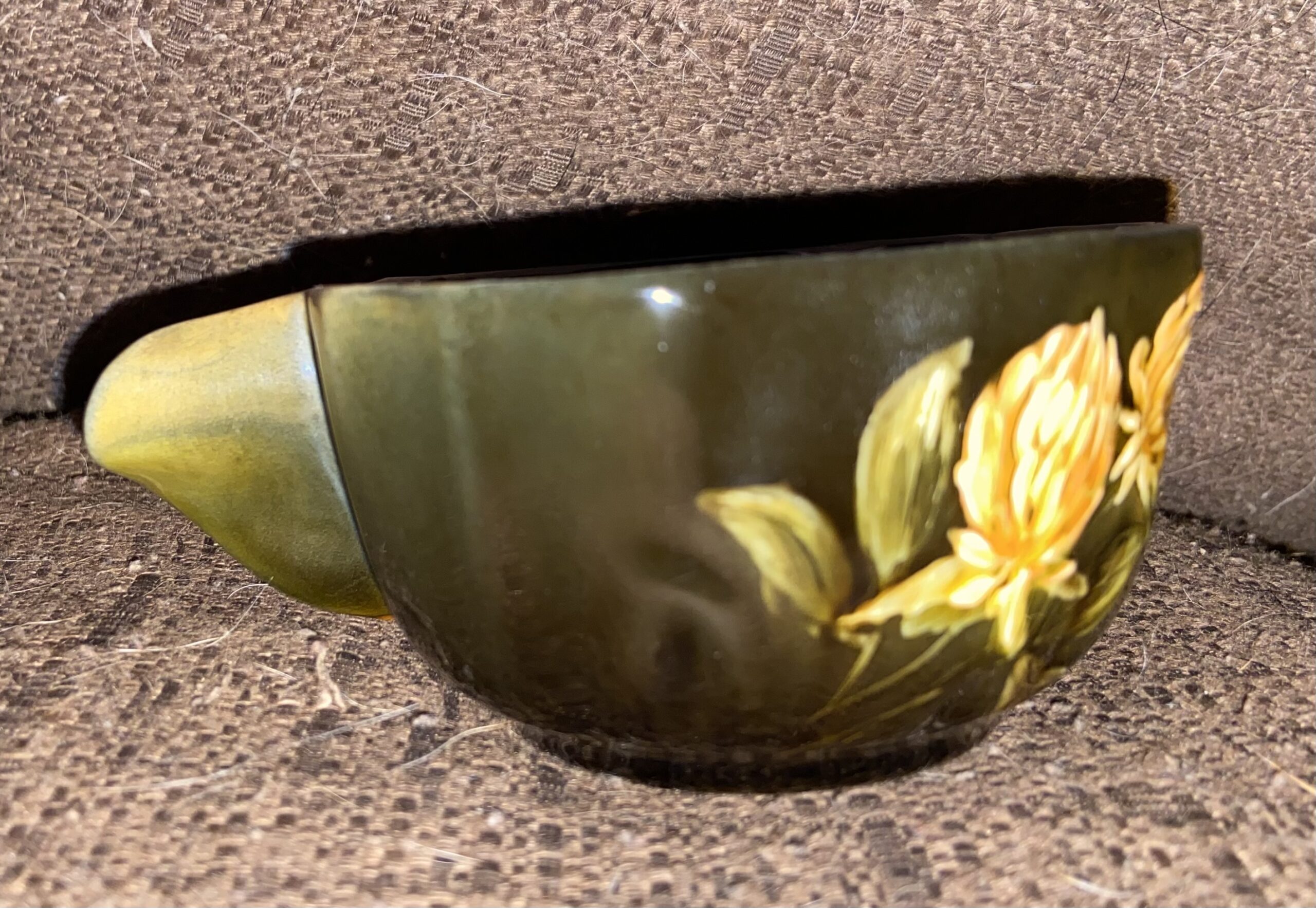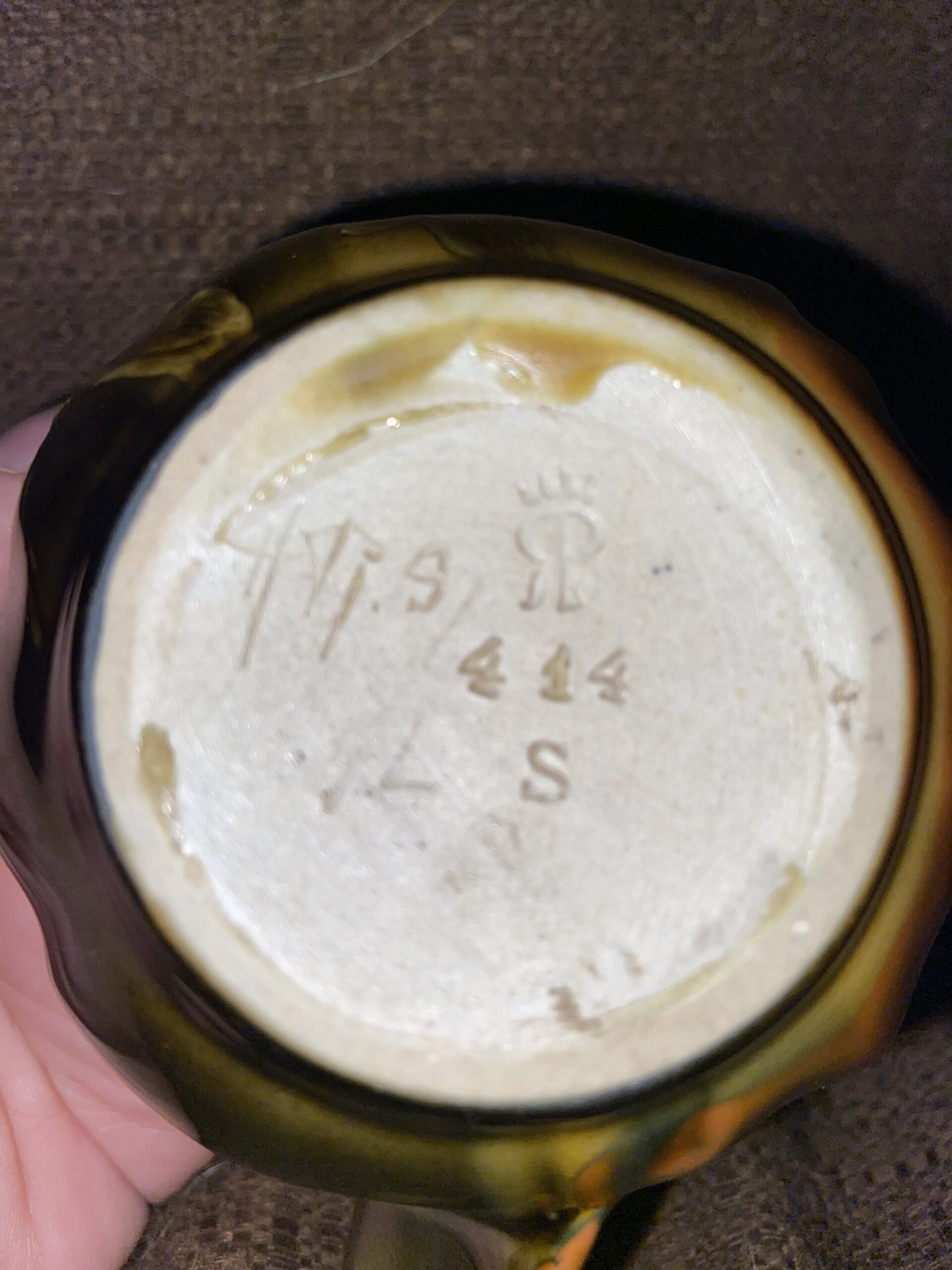 Home414414DescriptionTea cupDimensions3" diaDate Made1890Year of Purchase1980sPurchase Price (hammer or sale price, plus premium if applicable) ~$5Where PurchasedFlea MarketCommentsStandard glaze; cipher of Harriette R. Strafer; family heirloomGallery