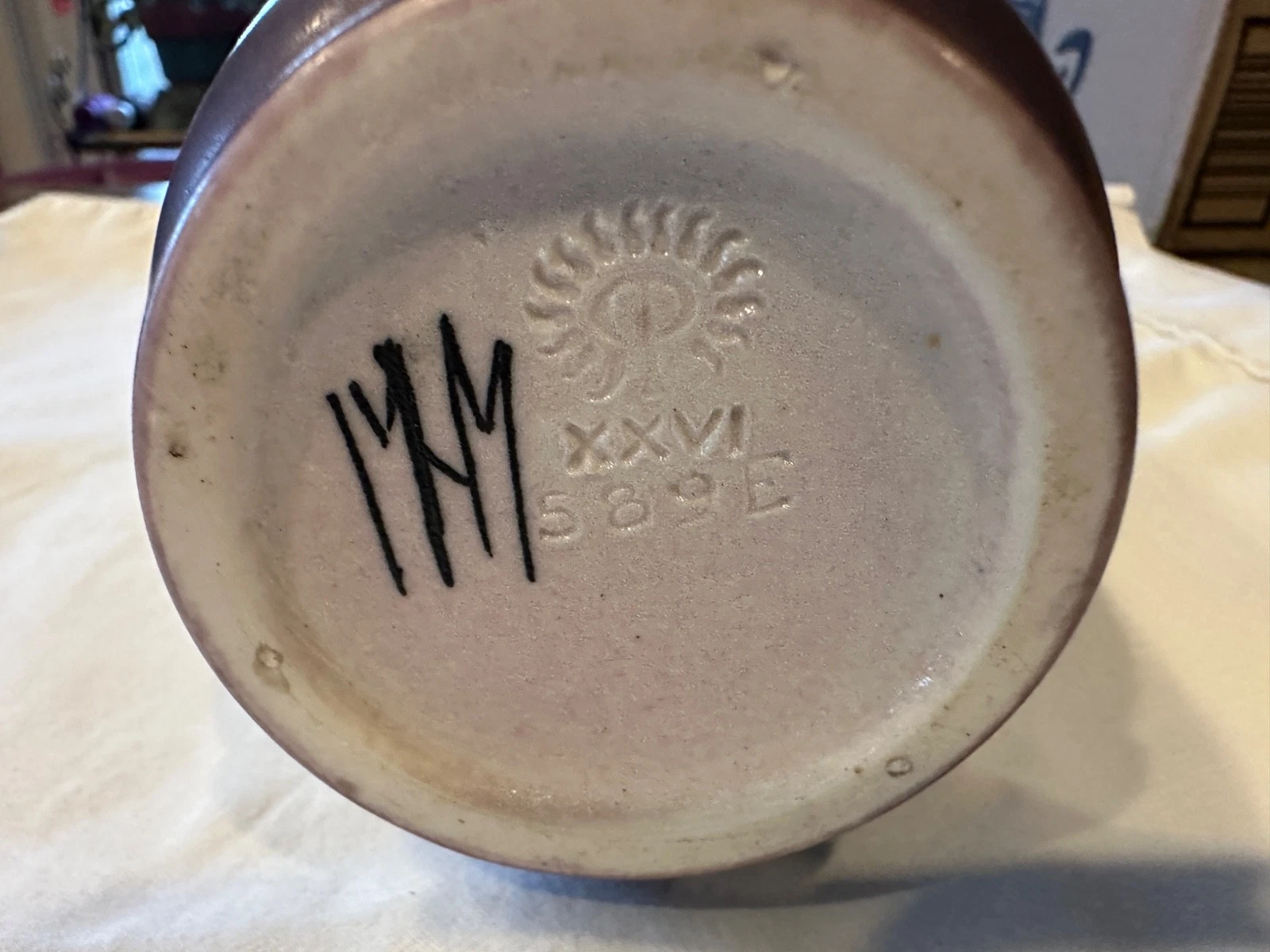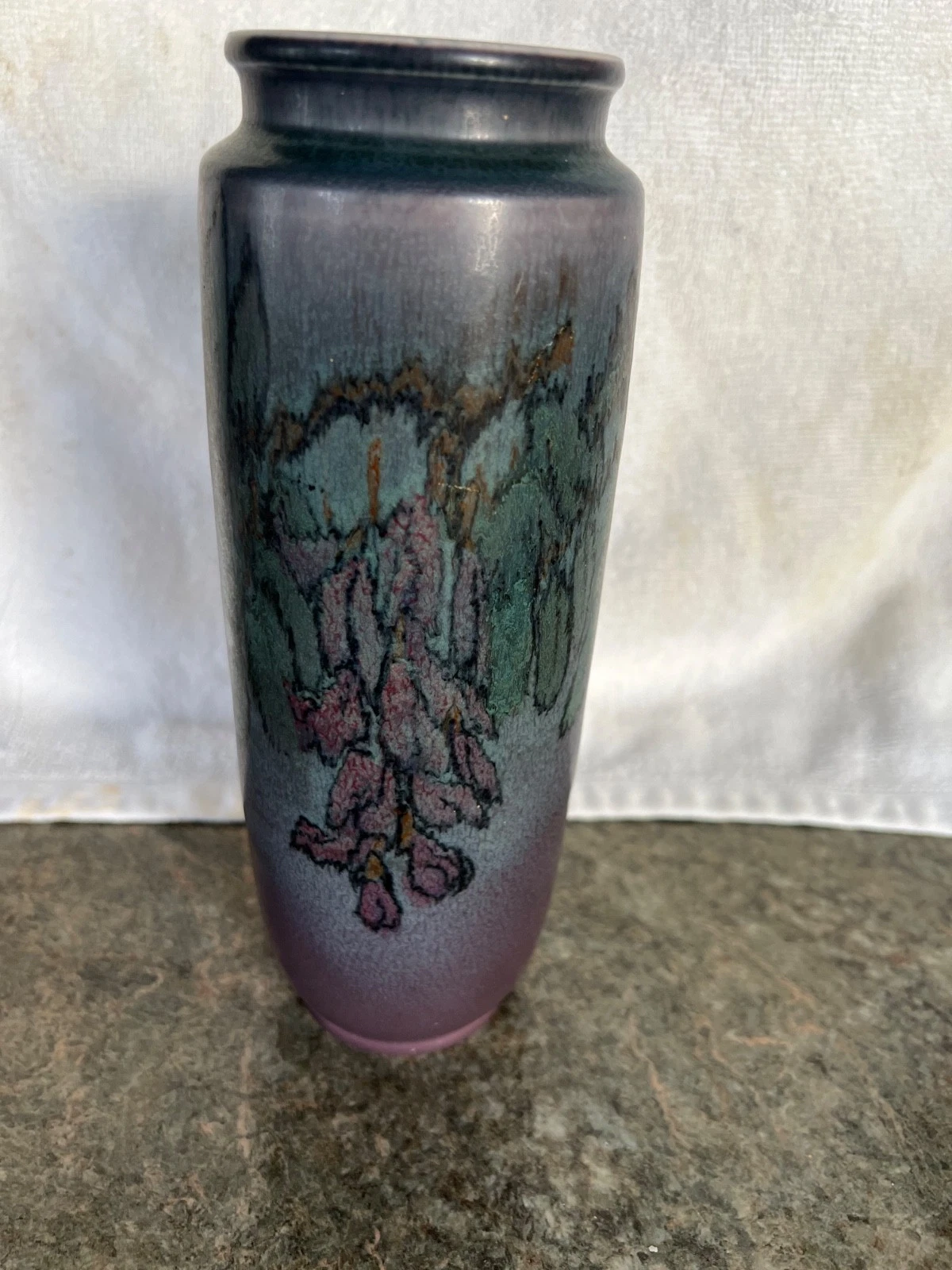 Home589(32)589(32)DescriptionTall VaseDimensions11" h x 3-1/2" diaDate Made1926Year of Purchase2026Purchase Price (hammer or sale price, plus premium if applicable) $510Where PurchasedeBayCommentsCipher of Margaret H. McDonaldGallery