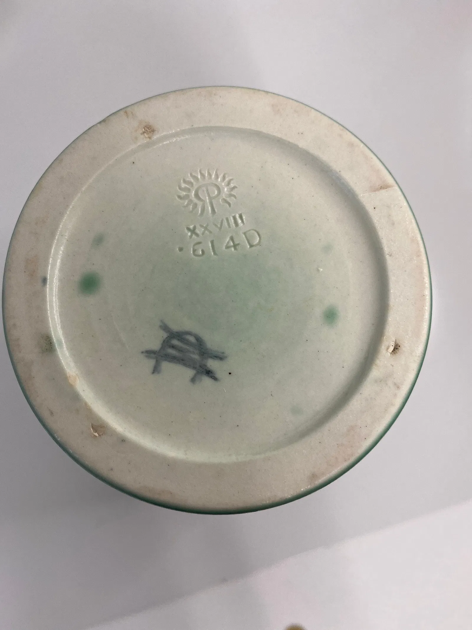 Home614(120)614(120)DescriptionTall VaseDimensions11" hDate Made1928Year of Purchase2025Purchase Price (hammer or sale price, plus premium if applicable) $310Where PurchasedMcCreary AuctionCommentsInked cipher of Delia WorkumGallery