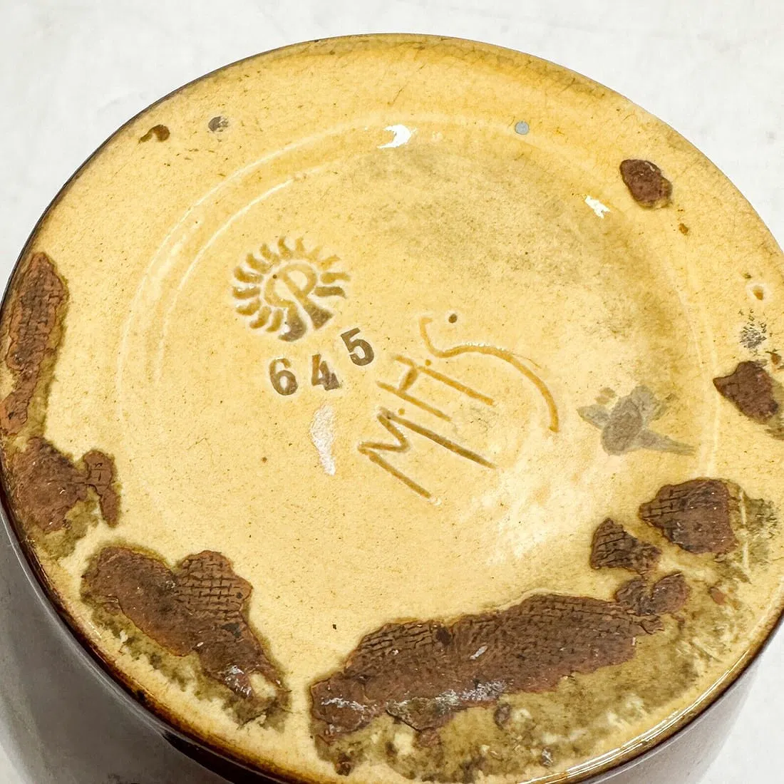 Home645(10)645(10)DescriptionMugDimensions4-5/8" h x 3-1/2" diaDate Made1899Year of Purchase2025Purchase Price (hammer or sale price, plus premium if applicable) $175Where PurchasedTaylor & HarrisCommentsStandard glaze; cipher of Marian H. SmalleyGallery
